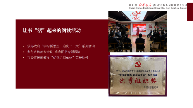 堅(jiān)持多渠道、多形式開展閱讀宣傳,營(yíng)造“愛讀書、讀好書、善讀書”的濃厚氛圍。一方面,主動(dòng)對(duì)接市委宣傳部、市文旅局等部門,融入全市閱讀推廣整體布局,在重要政策宣傳節(jié)點(diǎn)設(shè)置專題展陳、舉辦主題書展,配合做好重點(diǎn)讀物的宣傳推介。另一方面,利用門店展陳、線上平臺(tái)、讀書活動(dòng)等多種載體,廣泛宣傳優(yōu)秀出版物,讓好書被看見、被閱讀、被分享。通過持續(xù)的宣傳引導(dǎo),書店的文化品牌形象更加鮮明,服務(wù)城市文化建設(shè)的參與感與影響力不斷提升。