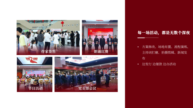 閱讀不僅在于“擁有”,更在于“激活”。分公司積極策劃并承辦各類主題閱讀活動(dòng),組織開展“講書比賽”“閱讀分享會(huì)”“作家見面會(huì)”等系列品牌活動(dòng)并與多家單位簽訂年度活動(dòng)協(xié)議,讓書籍在交流與分享中煥發(fā)活力。同時(shí),積極配合相關(guān)部門“掃黃打非·護(hù)苗”等專項(xiàng)行動(dòng),開展正版讀物宣傳與推廣。每場(chǎng)活動(dòng)均力求貼近參與者實(shí)際,通過互動(dòng)、講座、展覽等多種形式,將閱讀從個(gè)體行為延伸為社會(huì)文化交流,有效激發(fā)了群眾的閱讀熱情,營(yíng)造了積極向上的城市文化風(fēng)尚?!笆奈濉逼陂g舉辦閱讀活動(dòng)1000余場(chǎng)。